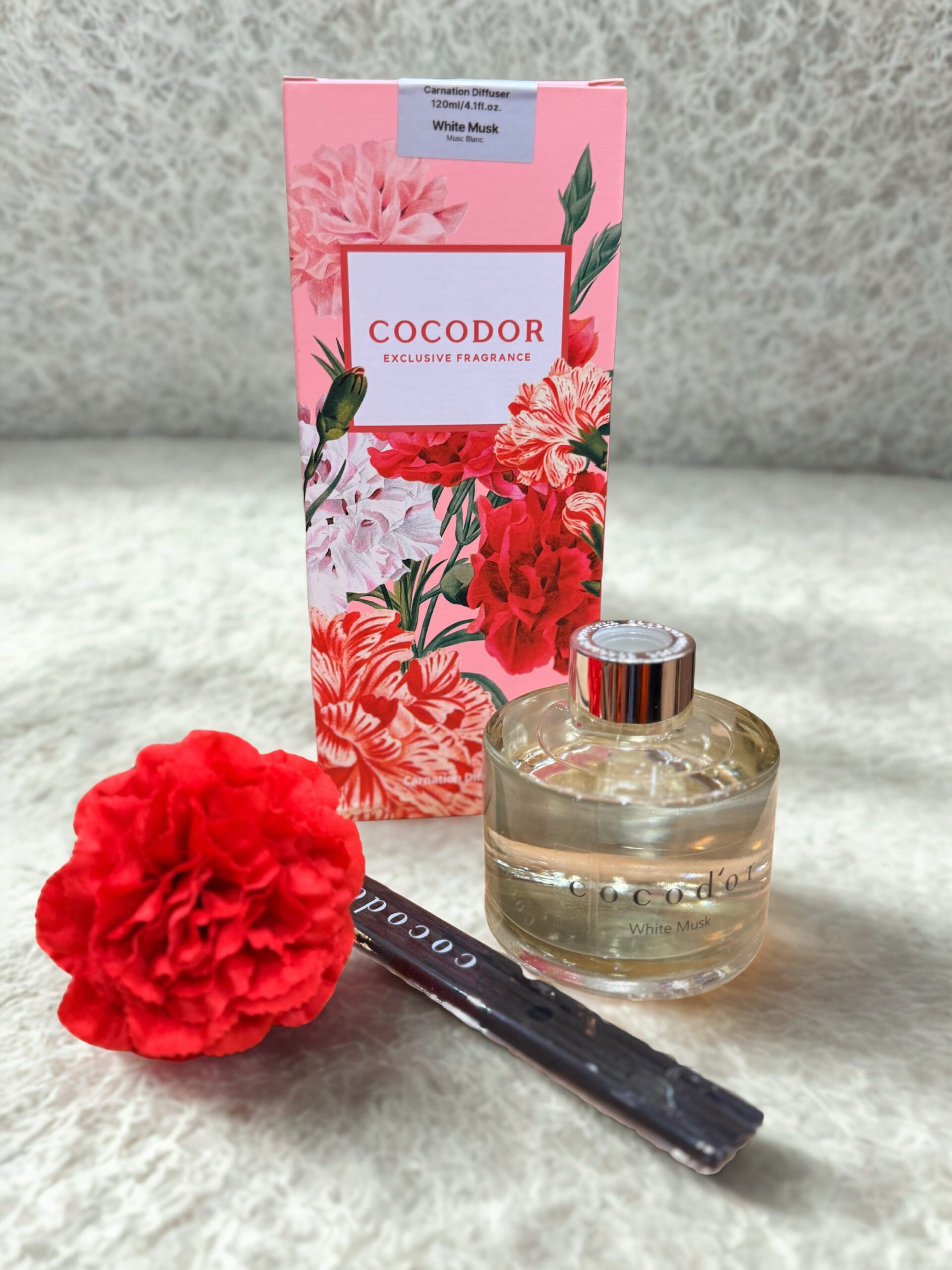 Diffuseur à roseaux Cocodor œillet 120 ml au parfum musc blanc – un parfum d’intérieur élégant et intemporel. Ce diffuseur de luxe comprend cinq roseaux noirs et une délicate fleur artificielle d’œillet, apportant une touche raffinée à votre décoration. La fragrance musc blanc mêle une base musquée riche et poudrée à des notes florales et boisées subtiles, créant un arôme doux et persistant qui apaise les sens. Idéal pour les chambres, salons, bureaux ou moments de détente façon spa, ce diffuseur durable offre une expérience parfumée sans flamme ni toxines. Transformez votre intérieur avec la senteur chaleureuse et réconfortante du musc blanc, une fragrance à la fois élégante et accueillante.