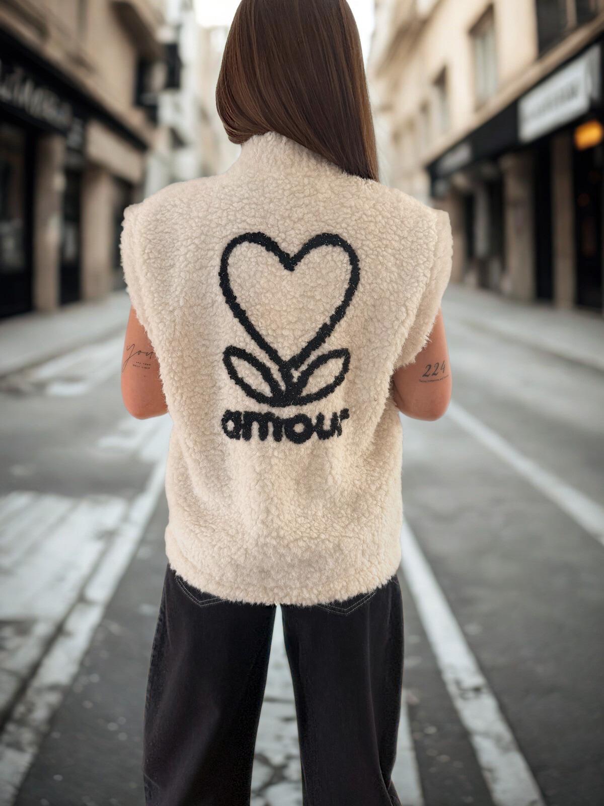 L’inscription au dos « Amour » ajoute une note délicate et moderne, faisant de cette veste une pièce pleine de caractère. Sa matière douce et sa coupe confortable, associées à une taille unique, permettent une adaptation harmonieuse à différentes morphologies.