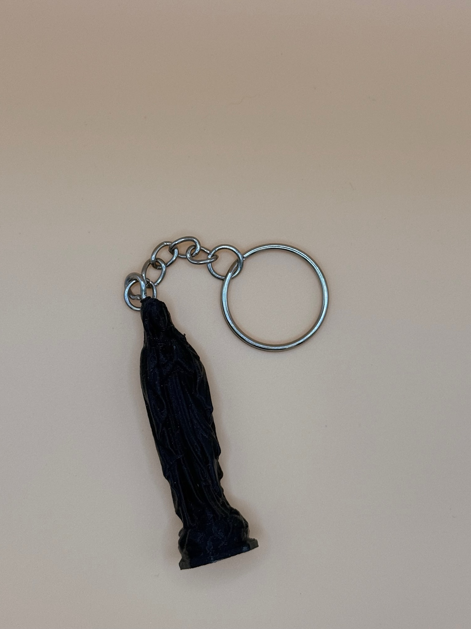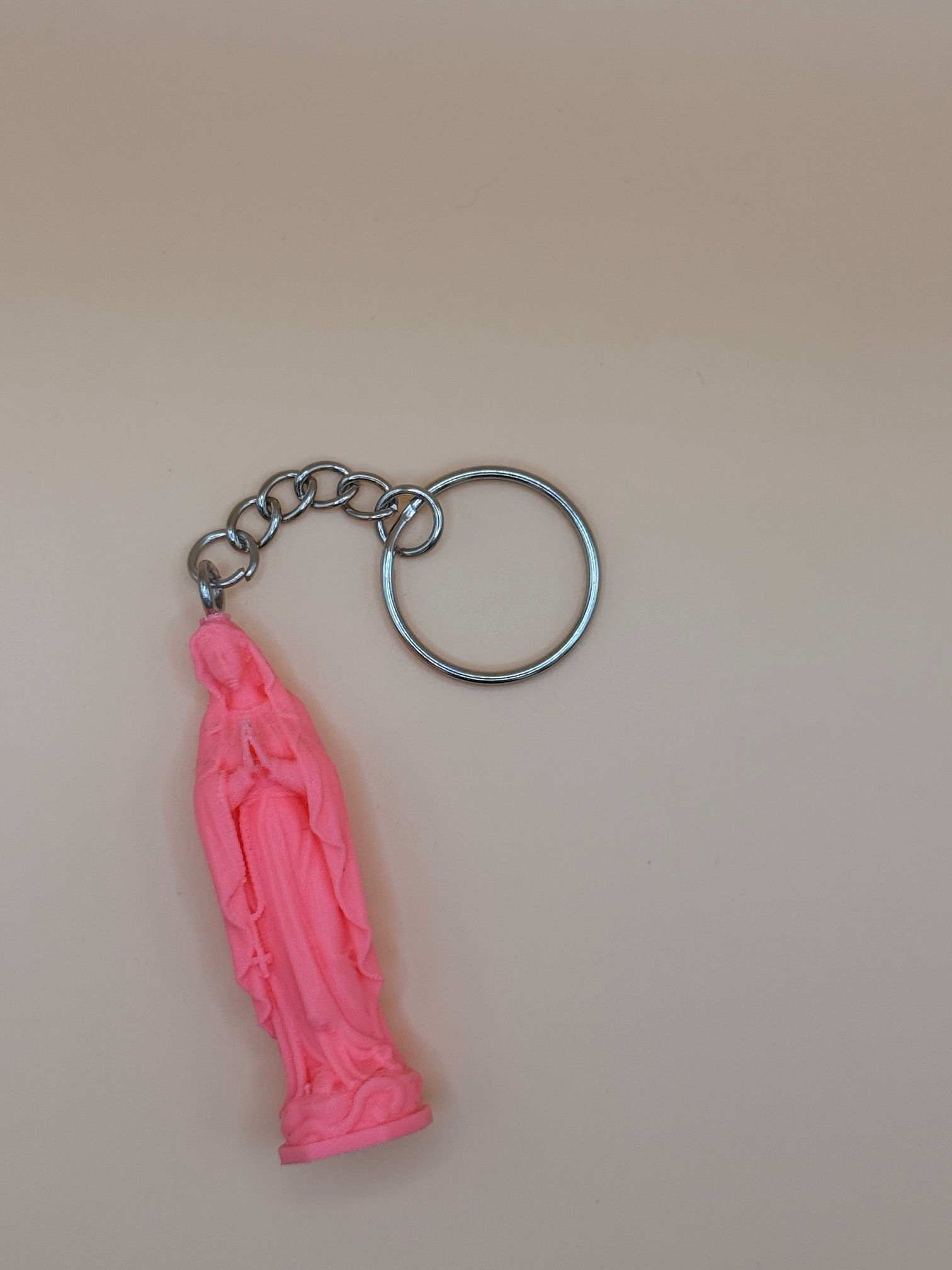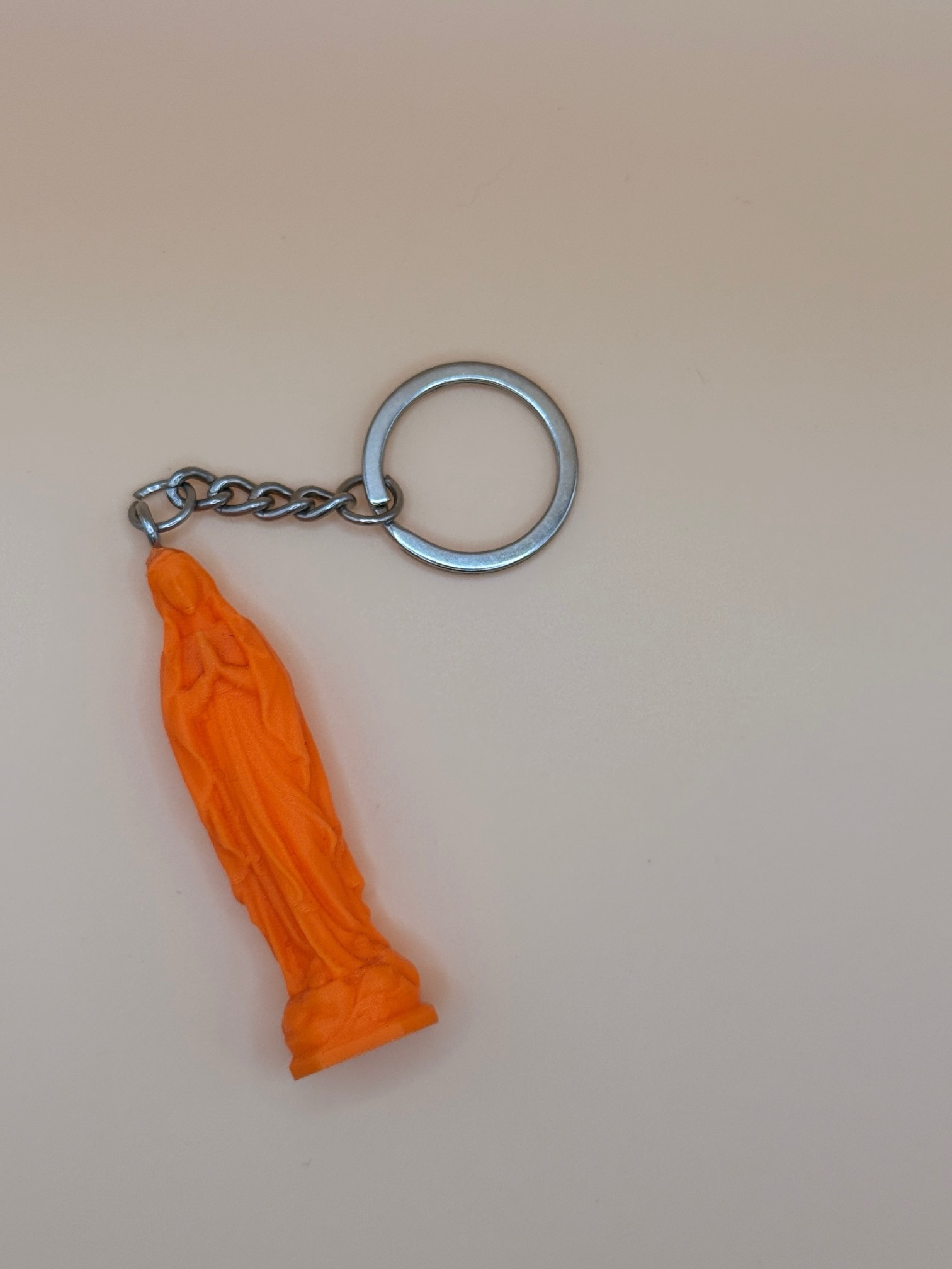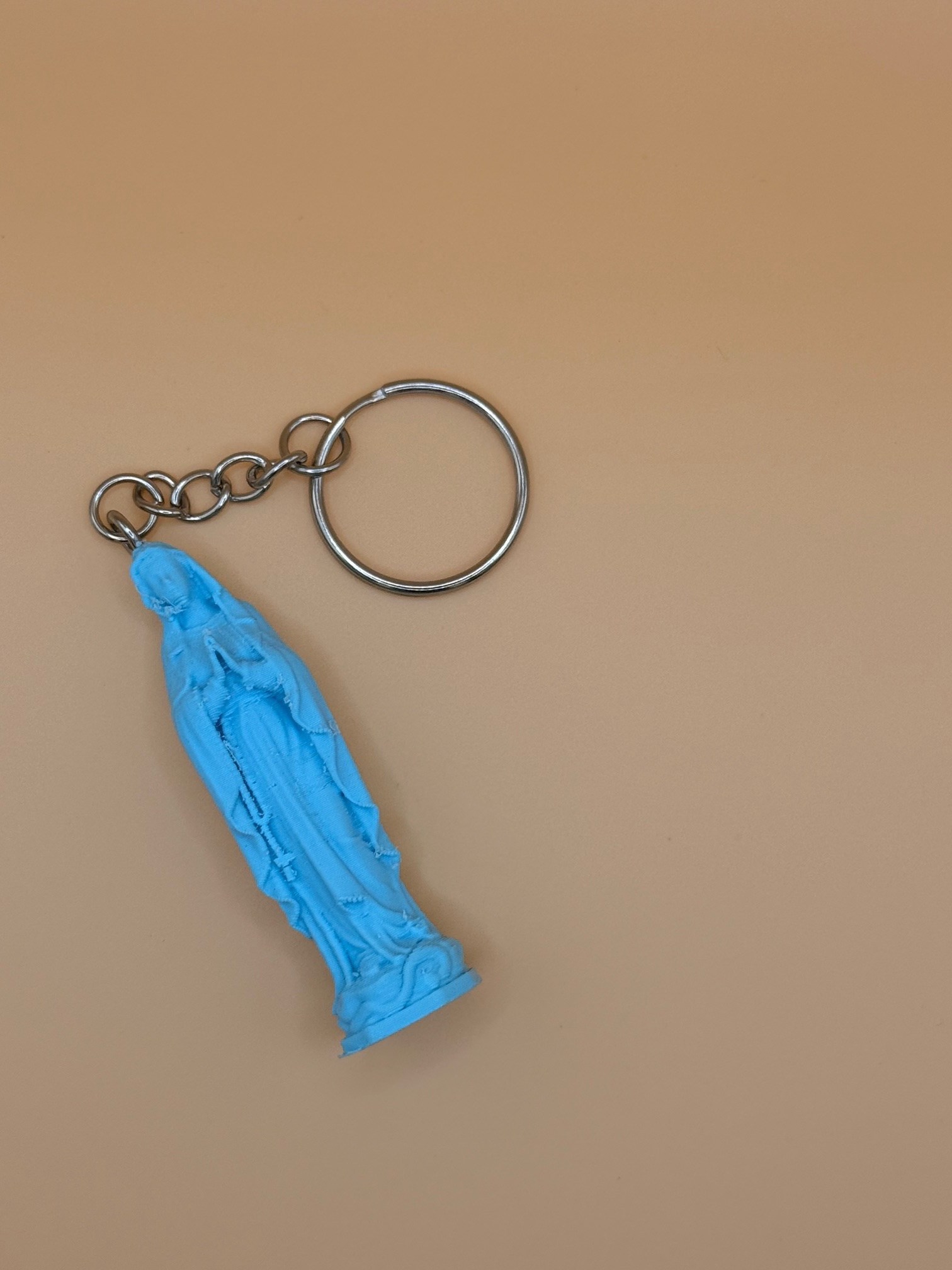 Porte-clés de la Vierge Marie imprimé en 3D en PLA. Léger, écologique et pratique, idéal comme souvenir religieux ou cadeau spirituel.