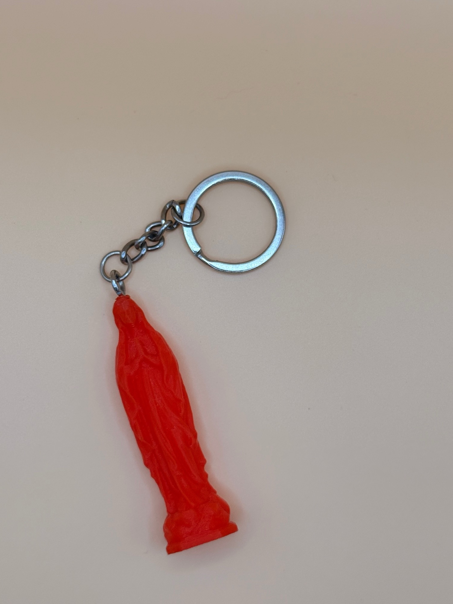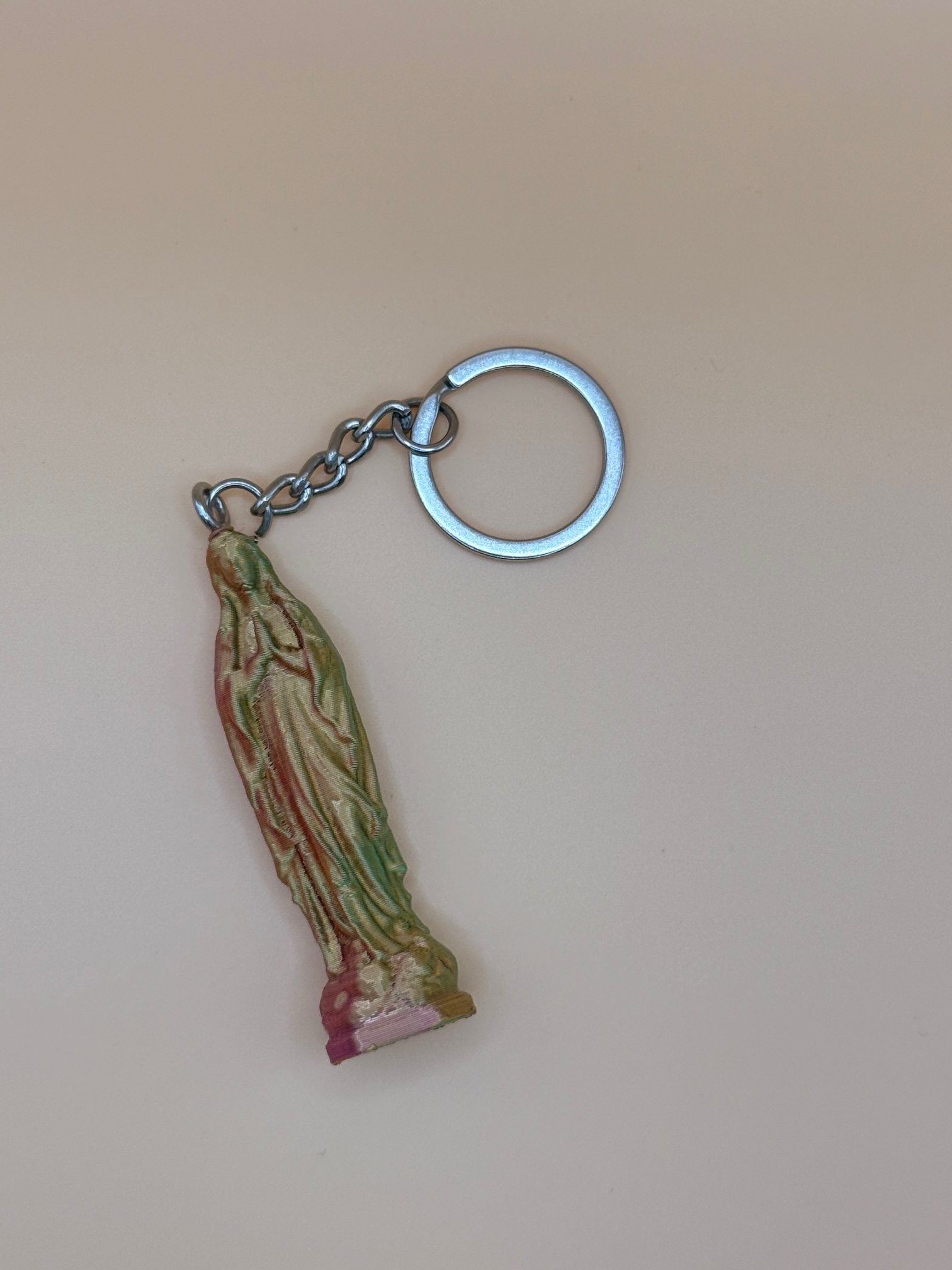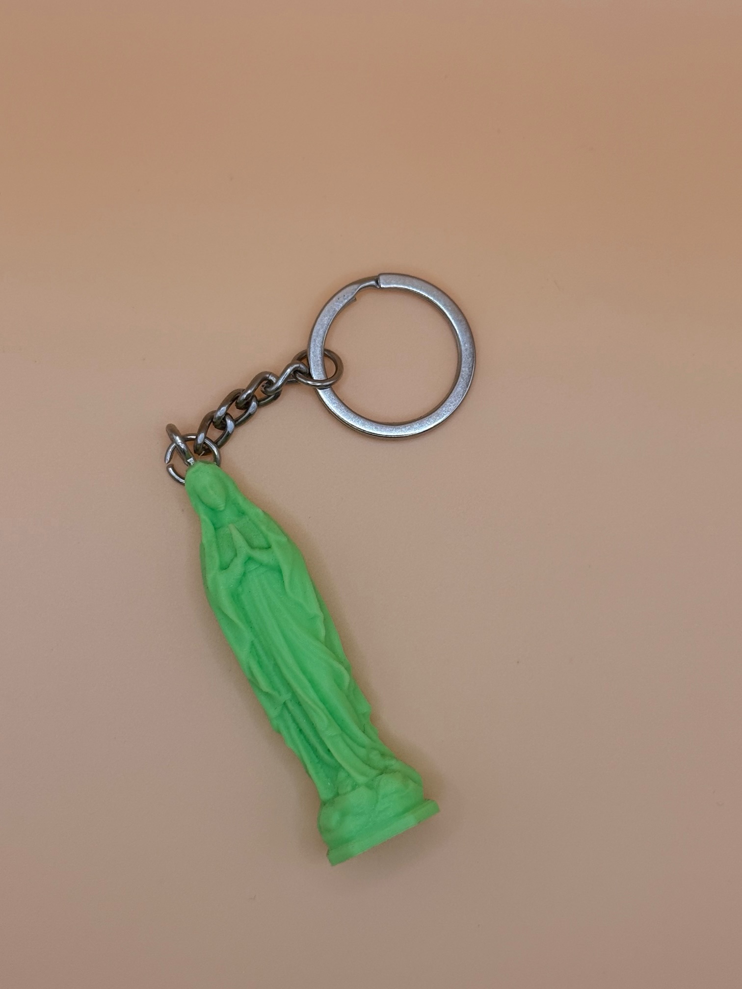 Porte-clés de la Vierge Marie imprimé en 3D en PLA. Léger, écologique et pratique, idéal comme souvenir religieux ou cadeau spirituel.