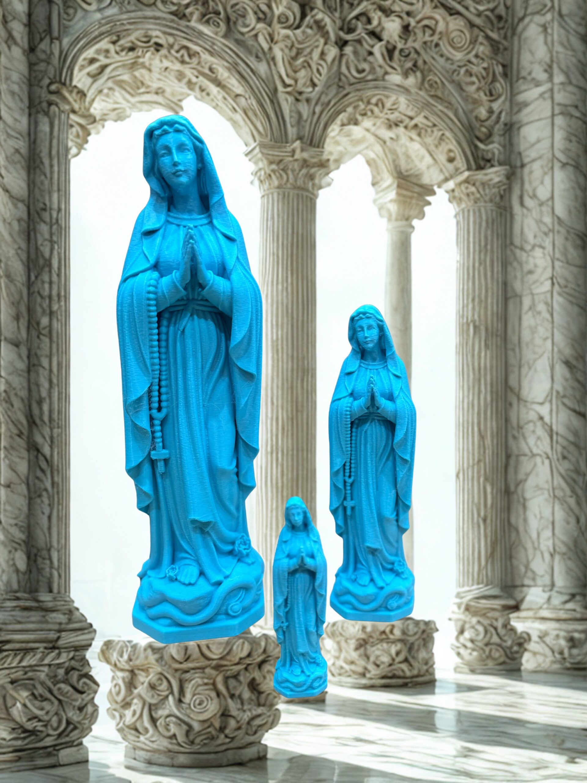 Statue de la Vierge Marie imprimée en 3D en PLA, fabriquée à Lourdes. Disponible en 3 tailles (8, 14 et 23 cm) et en plusieurs coloris. Idéale pour la prière, la décoration ou comme cadeau religieux.