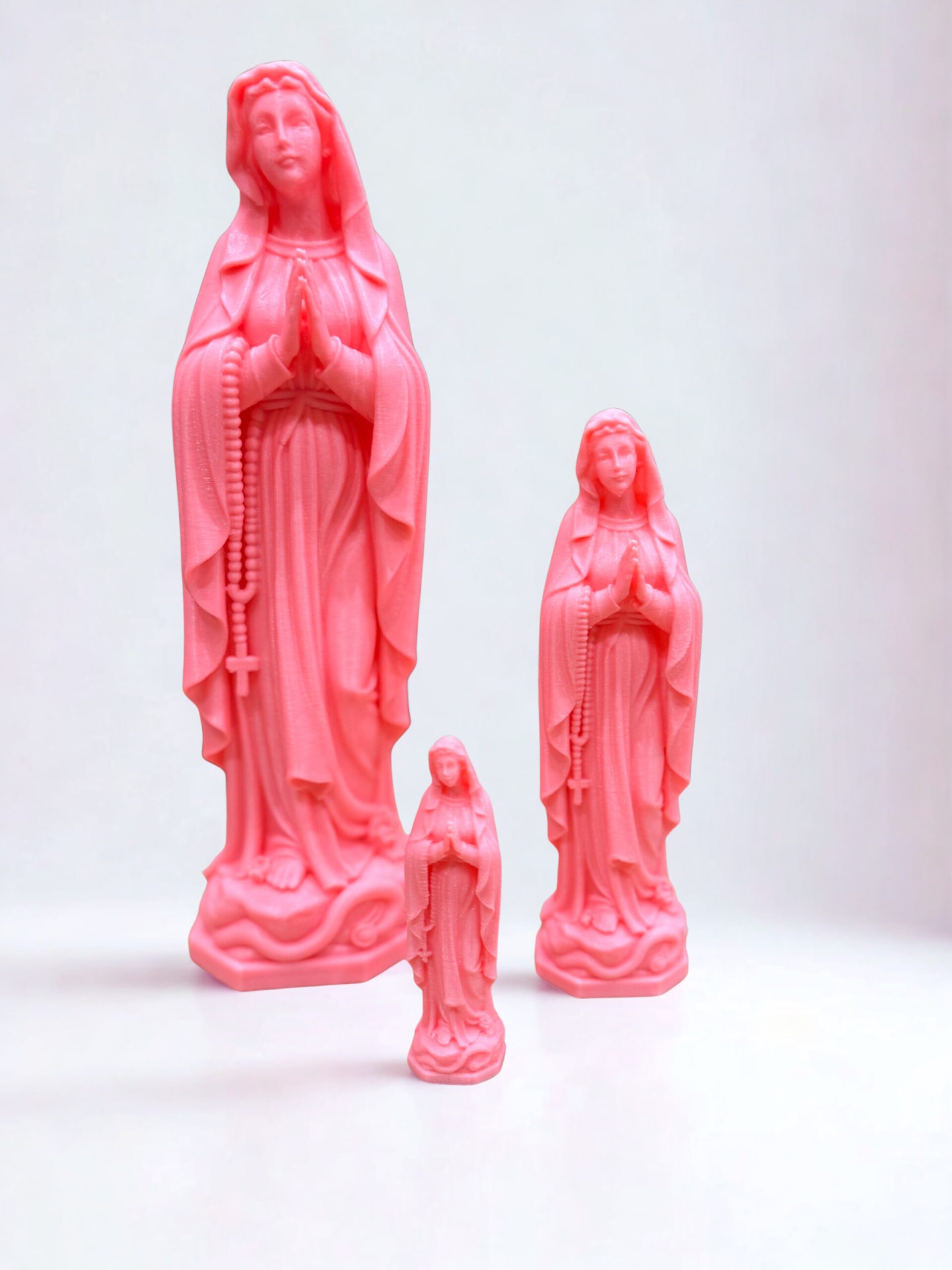 Statue de la Vierge Marie imprimée en 3D en PLA, fabriquée à Lourdes. Disponible en 3 tailles (8, 14 et 23 cm) et en plusieurs coloris. Idéale pour la prière, la décoration ou comme cadeau religieux.