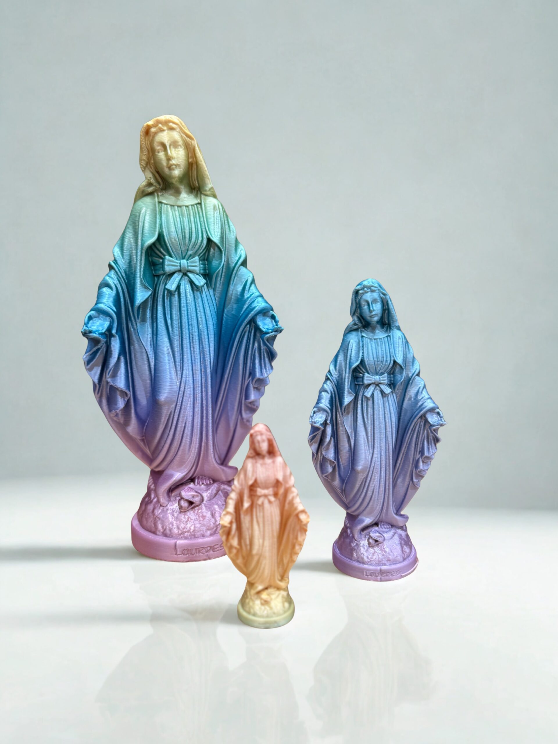 Expédition dans les 48HStatue de la Vierge Marie imprimée en 3D en PLA, fabriquée à Lourdes. Disponible en 3 tailles (8, 13.5et 21cm) et en plusieurs coloris. Idéale pour la prière, la décoration ou comme cadeau religieux.