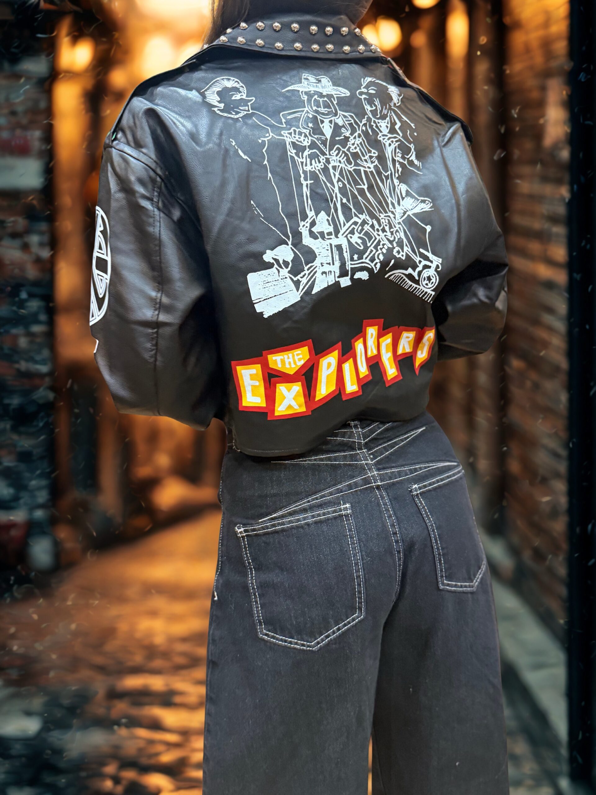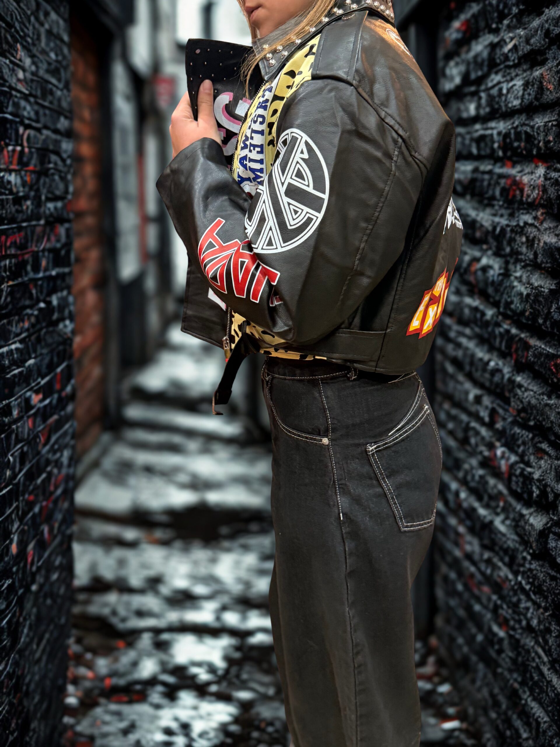 Affirmez votre style avec cette veste en cuir au caractère audacieux et résolument urbain. Inspirée de l’univers biker et street art, elle se distingue par ses patchs graphiques multicolores, ses inscriptions contrastées et ses clous métalliques sur le col et les épaules, qui lui confèrent une allure rock assumée.